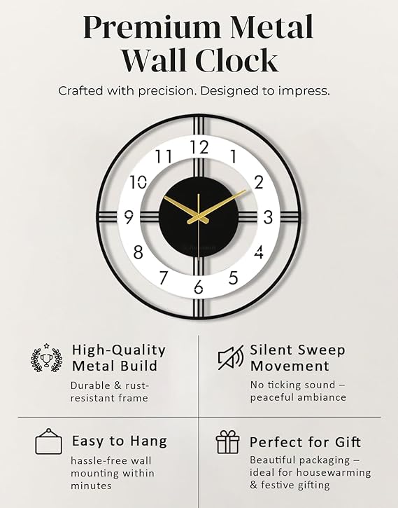- Big Size Metal Wall Clock: This big wall clock for living room measures 40 cm and is made of premium metal, offering durability and a bold presence. Ideal for hallways or any large wall needing a stylish and modern timepiece.